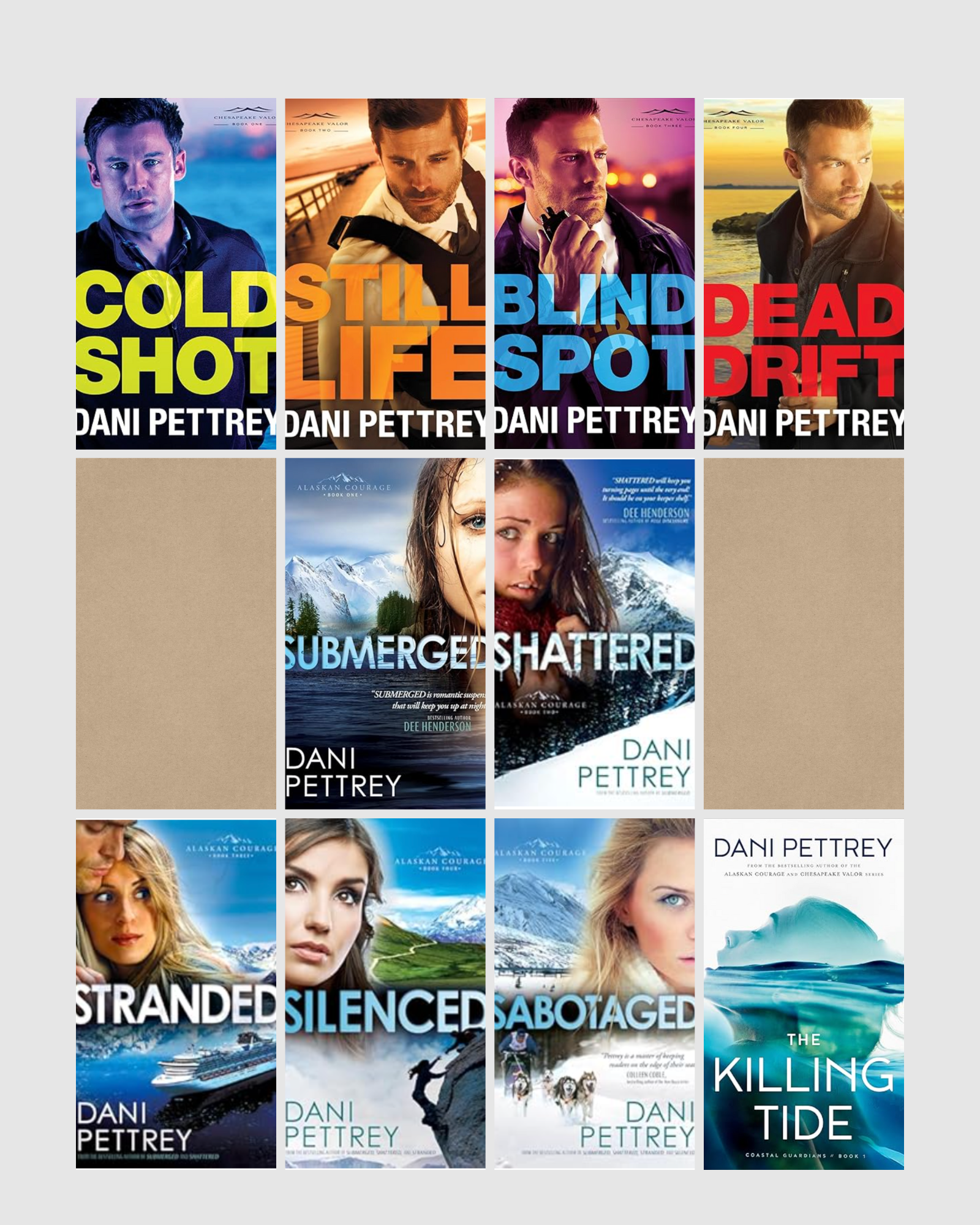 Dani Pettrey's suspense is laced with romance and redemption arcs. While the characters dodge bullet and bring the bad guys to justice, they're finding romance and healing from past hurts. I don't think there's a book of hers I don't like. They're all wonderful and engrossing.