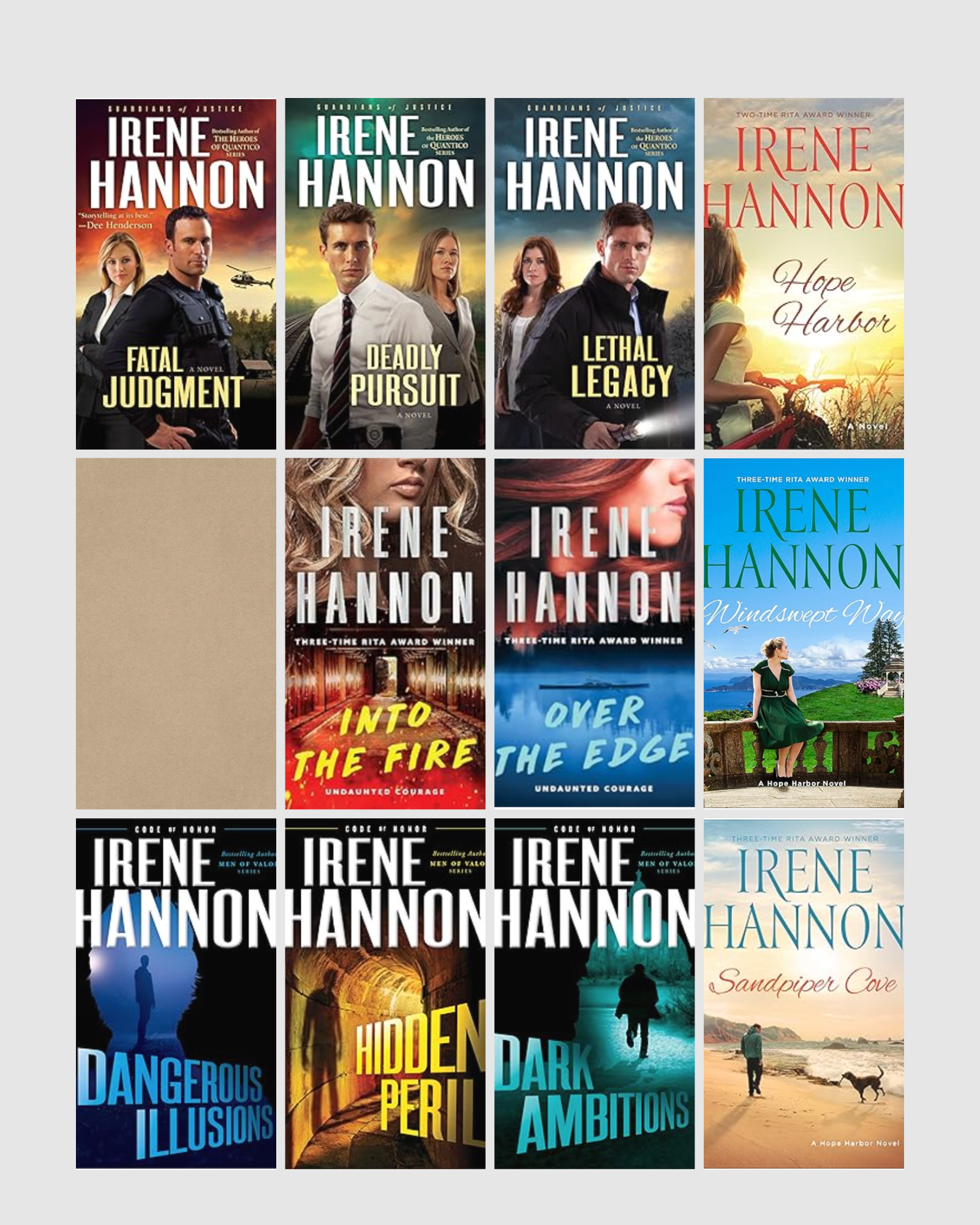 I can always count on an Irene Hannon for a pulse-pounding suspense. Her intricate plots always have me guessing and I never know what's going to happen next. Couple that with her sweet romance and you've got a wonderful story. Her contemporary novels also have swoony romance and thoughtful plots.